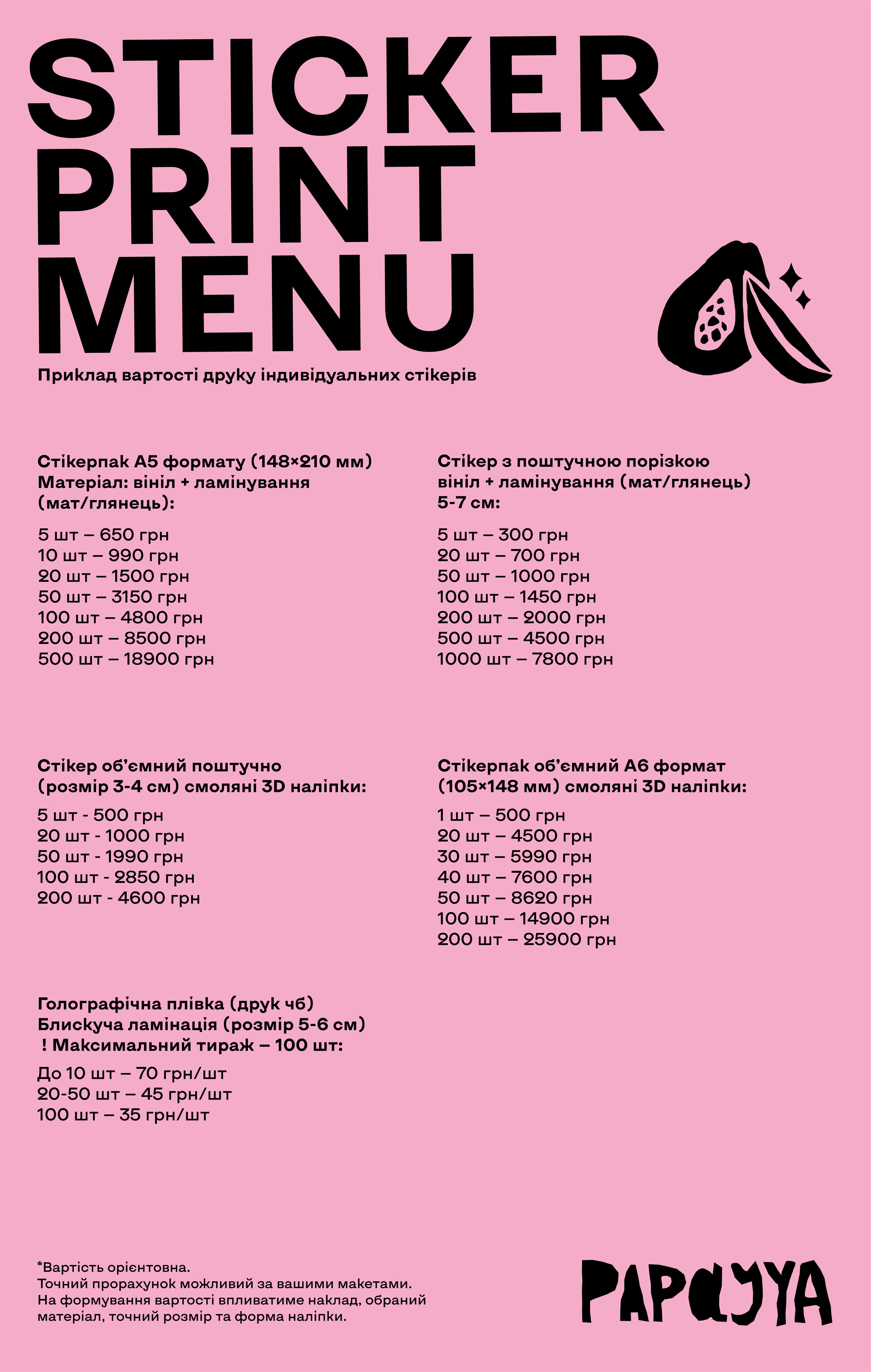 Матеріали: вініл білий або прозорий з матовим або глянсовим ламінуванням; обʼємні 3D наліпки; голографічні/блискучі вінілові стікери (обмежений тираж до 100 шт)